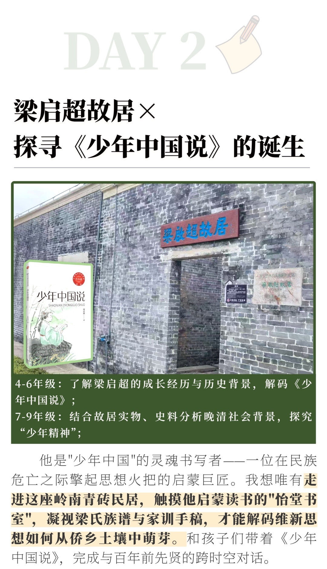 在巴金笔下的小鸟天堂学习观察与细节描写,在崖门古战场实践情景交融的片段写作,在碉楼村落中梳理游记结构与个人感悟。如何抓取特征、安排详略、融情于景,帮助孩子积累鲜活素材、夯实表达能力,在行走中真正实现“有所见、有所感、有所写”,让写作成为自然而有成就感的输出。