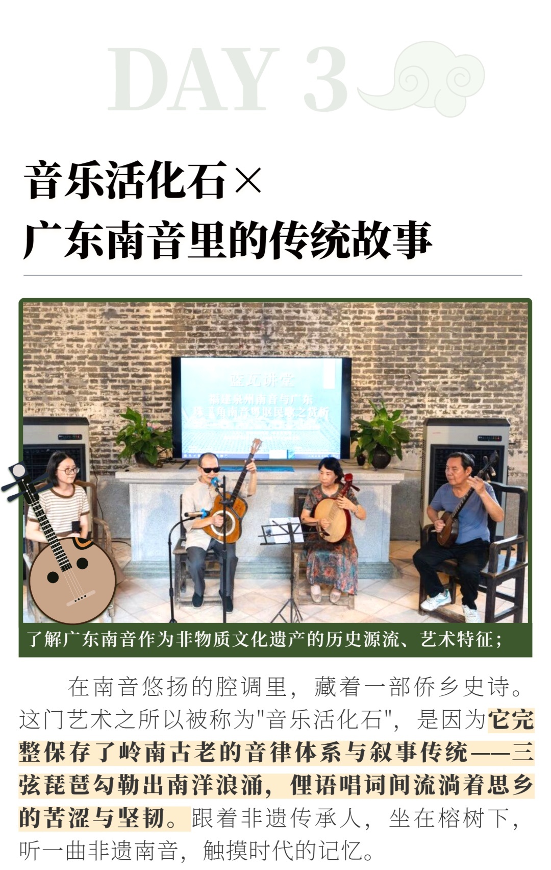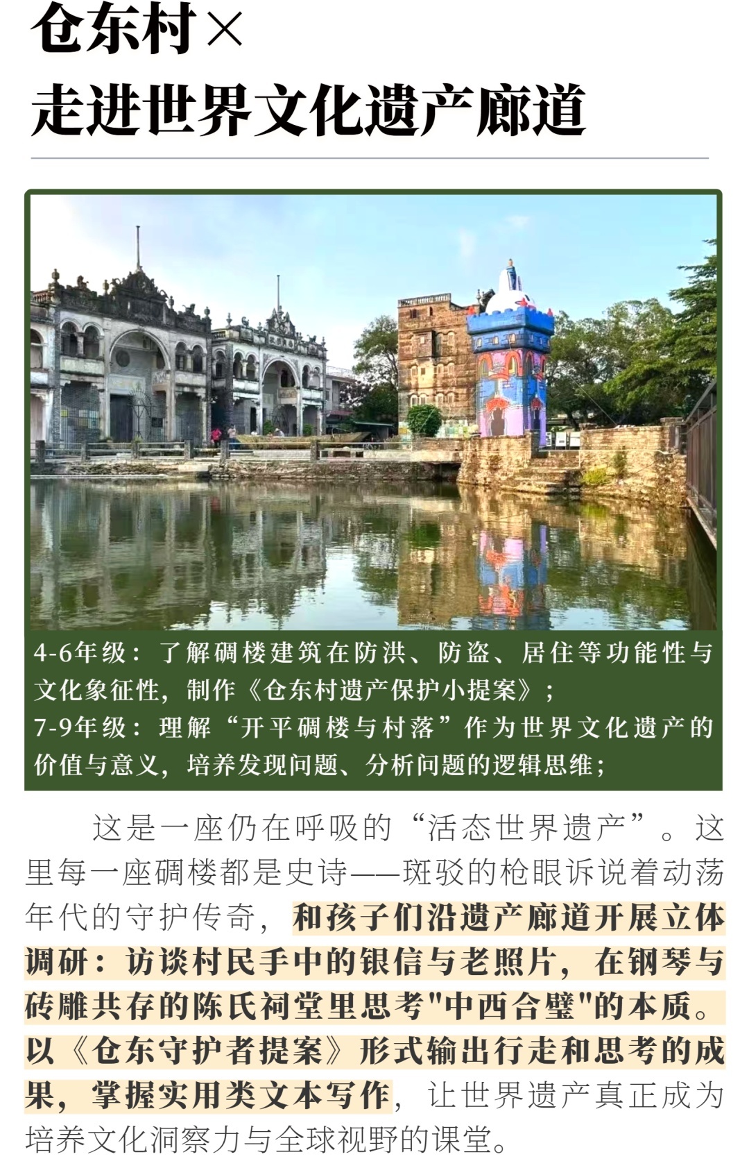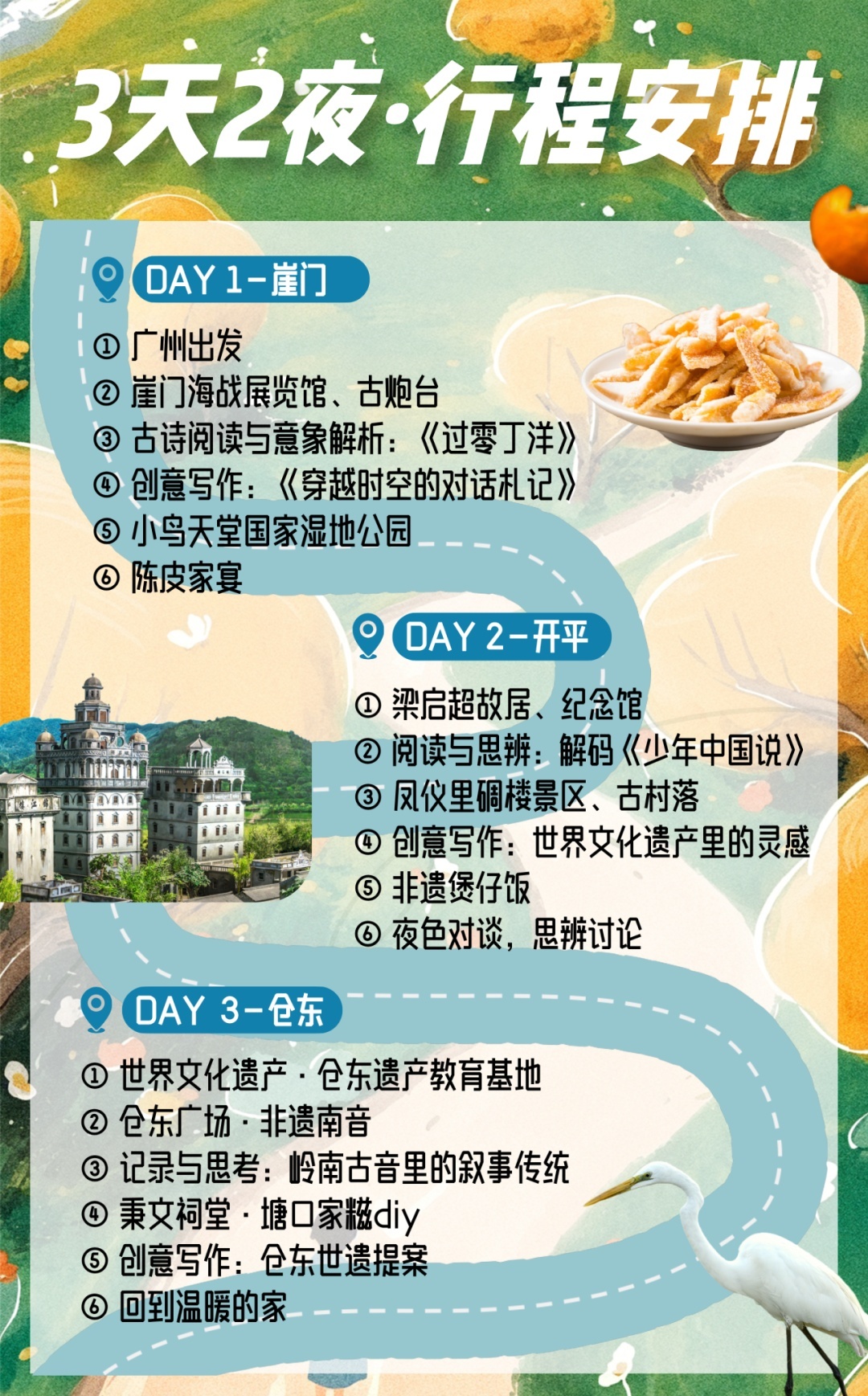 将和孩子们在仓东村亲耳聆听“音乐活化石”南音的悠扬曲韵,亲手制作非遗塘口家糍,在指尖的敲捏中感受传承的温度;更将夜宿于凤仪里古村落,推窗即见稻田碉楼,沉浸于世界文化遗产的静谧日常。这一切独特的设计,只为让孩子触摸到五邑大地最真实的文化脉搏。
