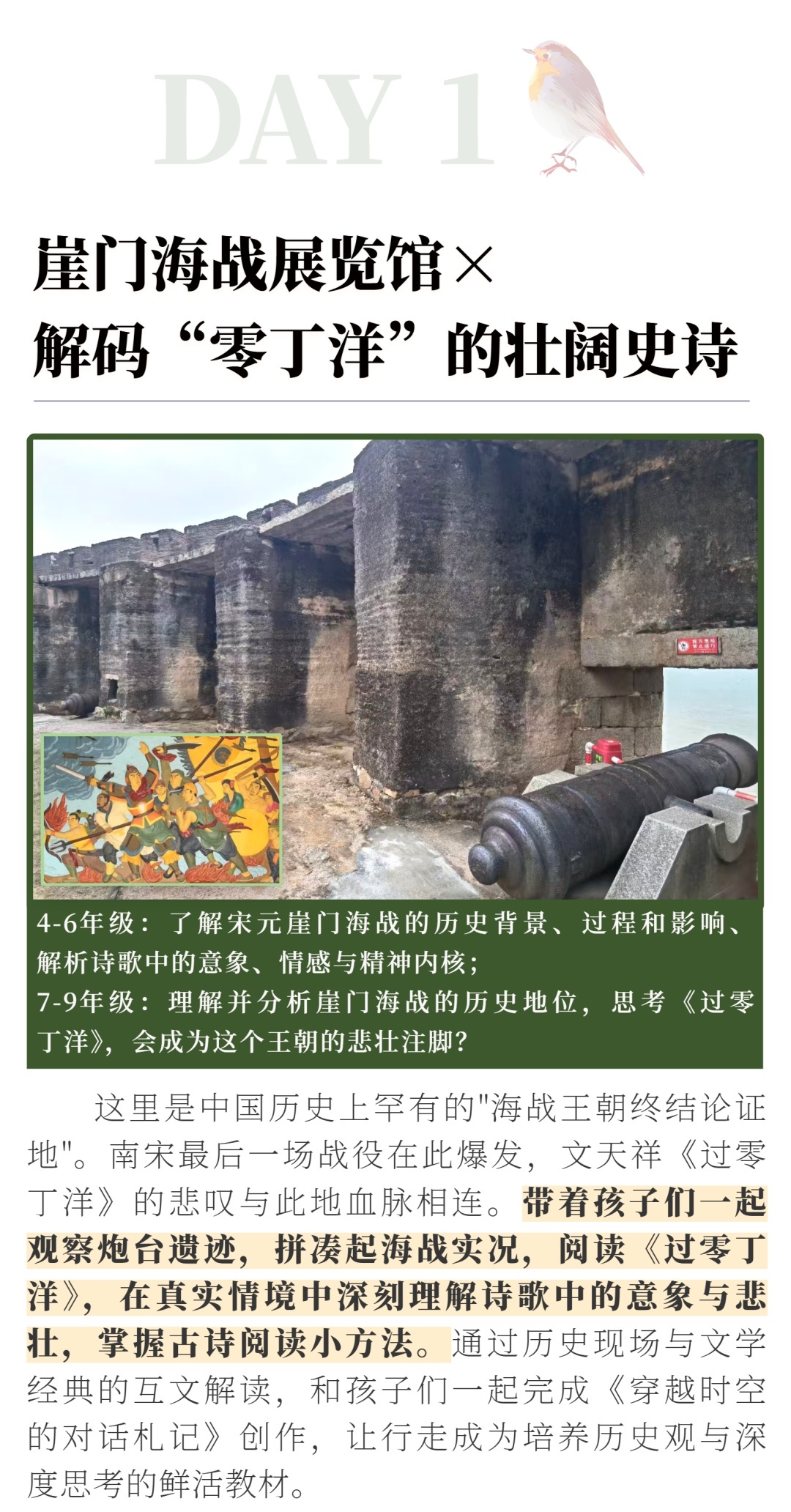研学之旅不仅仅是实地行走,更是在课前、课中串联诗歌《过零丁洋》、文学作品《少年中国说》、《小鸟天堂》及宋元海战、晚清变法、世界贸易等历史知识,让每一处景点,都变成孩子们的实景课堂。